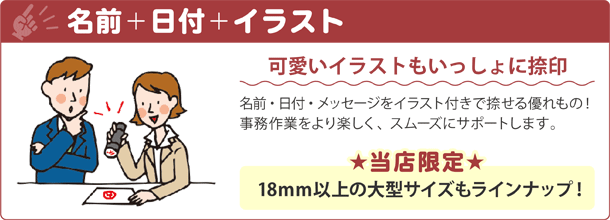 当店限定の印面にかわいいイラストが入った大きいサイズの日付印です。41パターンのイラストからお好きなデザインをお選びいただけます。