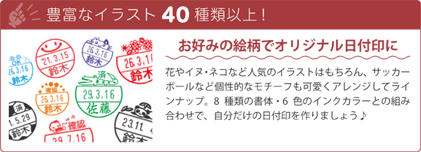 印面にかわいいイラストが入った日付印。53パターンのイラストからお好きなデザインをお選びいただけます。6色のインクカラーと組み合わせて、オフィスで注目のスタンプです。